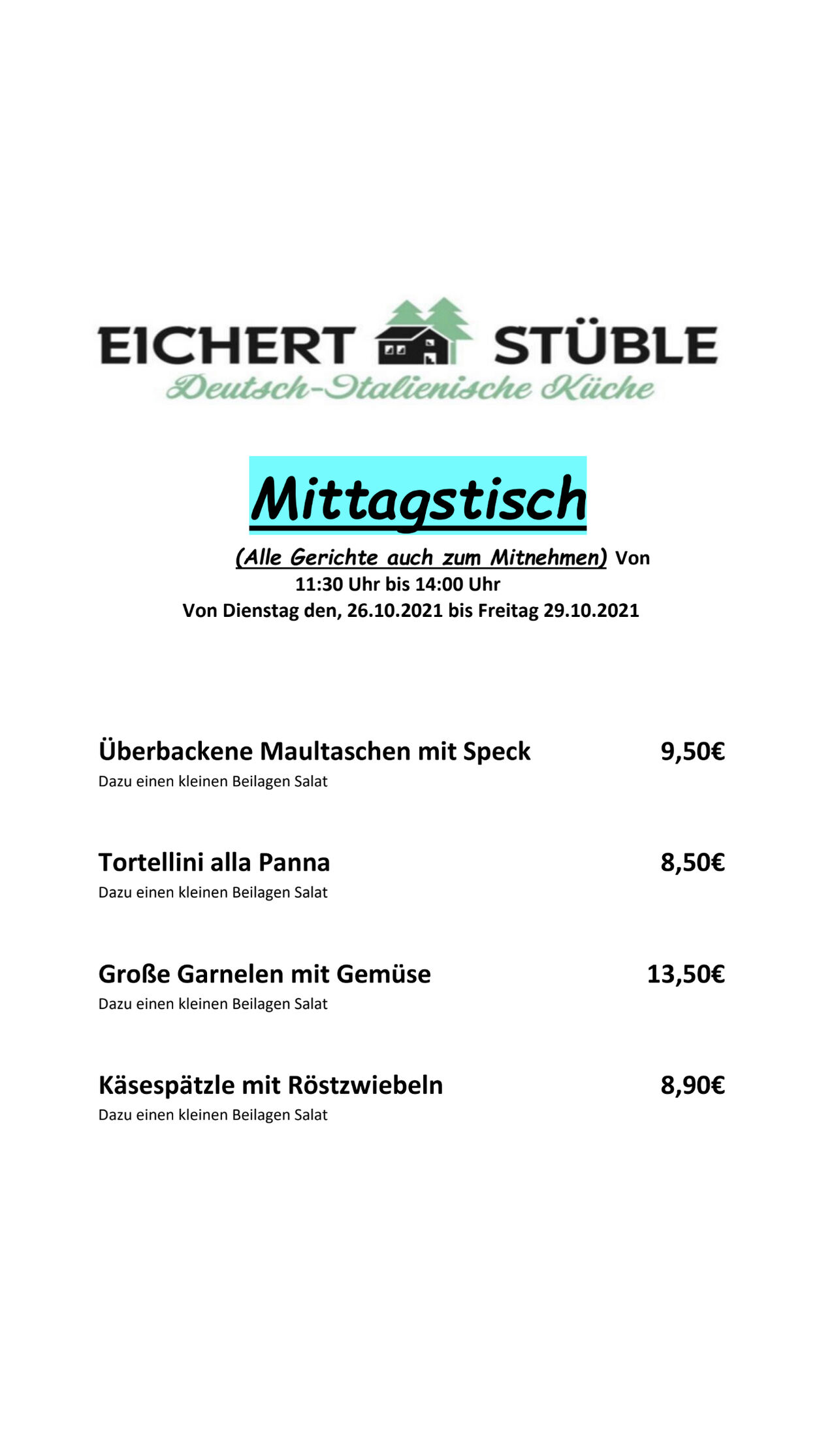 Samstags und Sonntags werden wir auch außergewöhnliche Sachen wie Hausgemachte Ravioli oder Cannelloni und Frische Fisch anbieten.